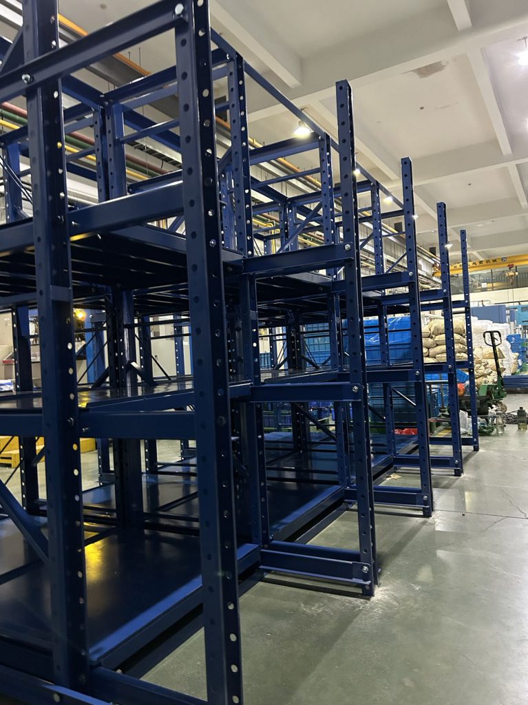 全抽模具架靠墻,配合行車,存取模具的時候把抽屜抽出,吊裝好以后再吧抽屜推進去,